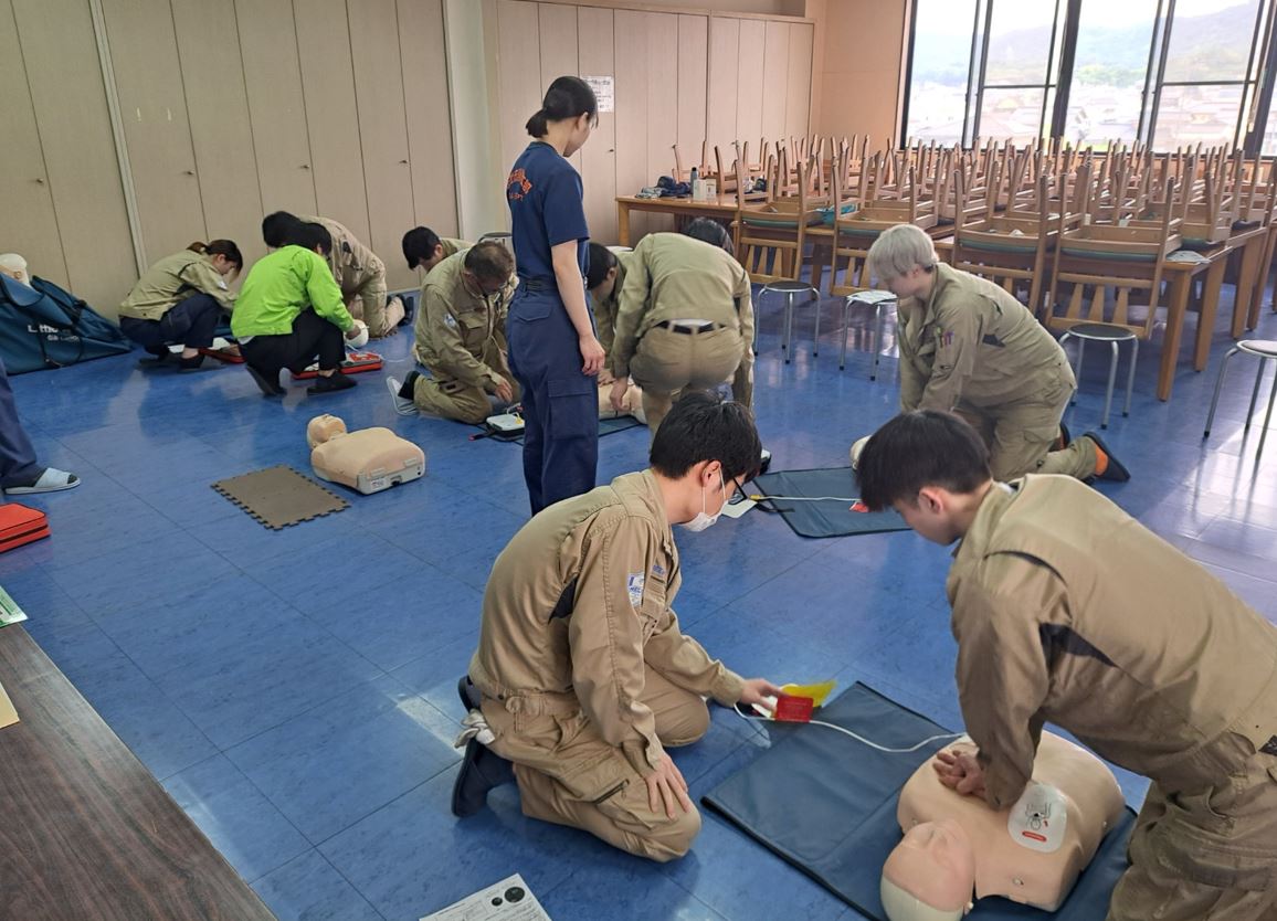 当社では毎年、総社市消防署の救急救命士の方々に来ていただき、心肺蘇生法(胸骨圧迫、AED)や止血法について講習を行っていただいております。