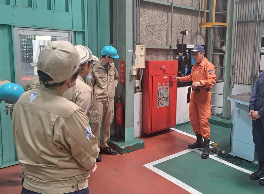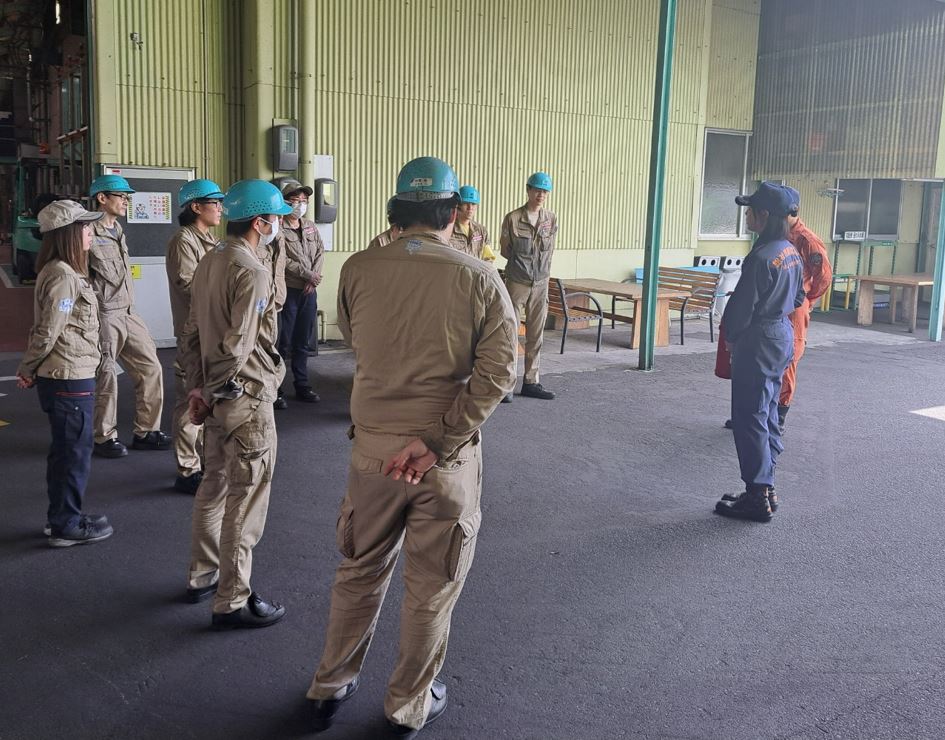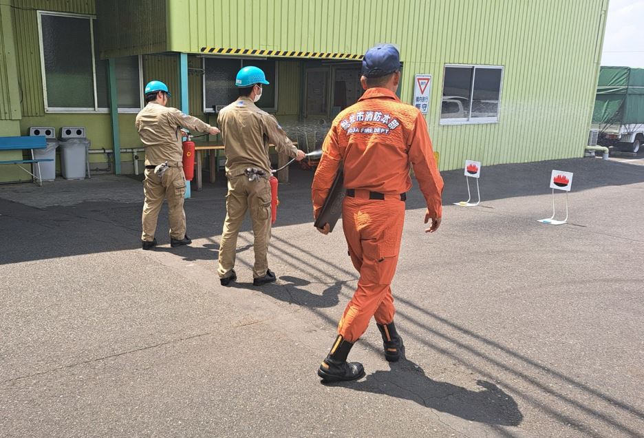 当社では毎年、総社市消防署の隊員の方々に来ていただき、防災講話、消火訓練、屋内消火栓の使用方法などについて、訓練を行なっていただいております。
