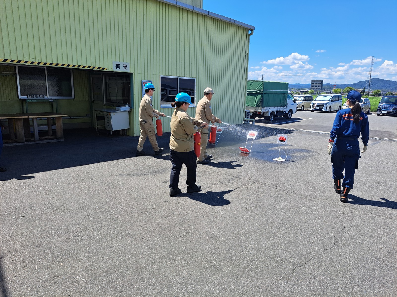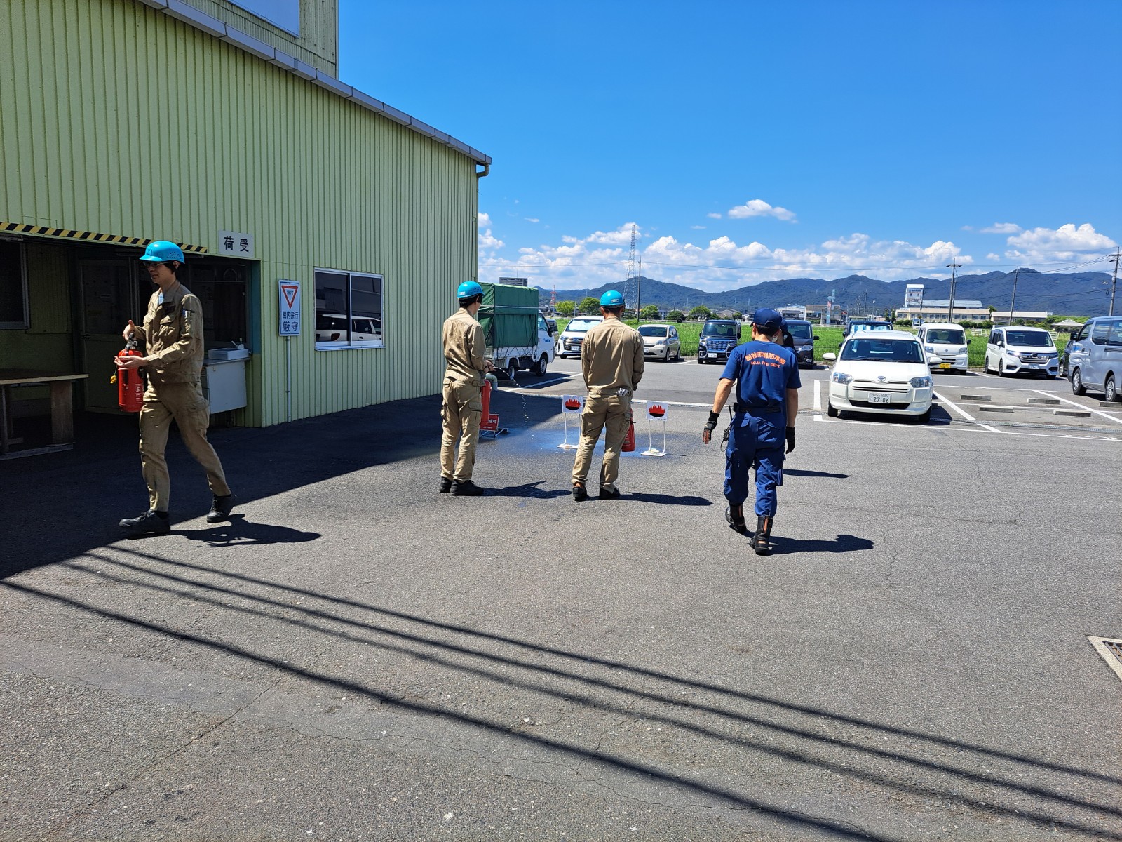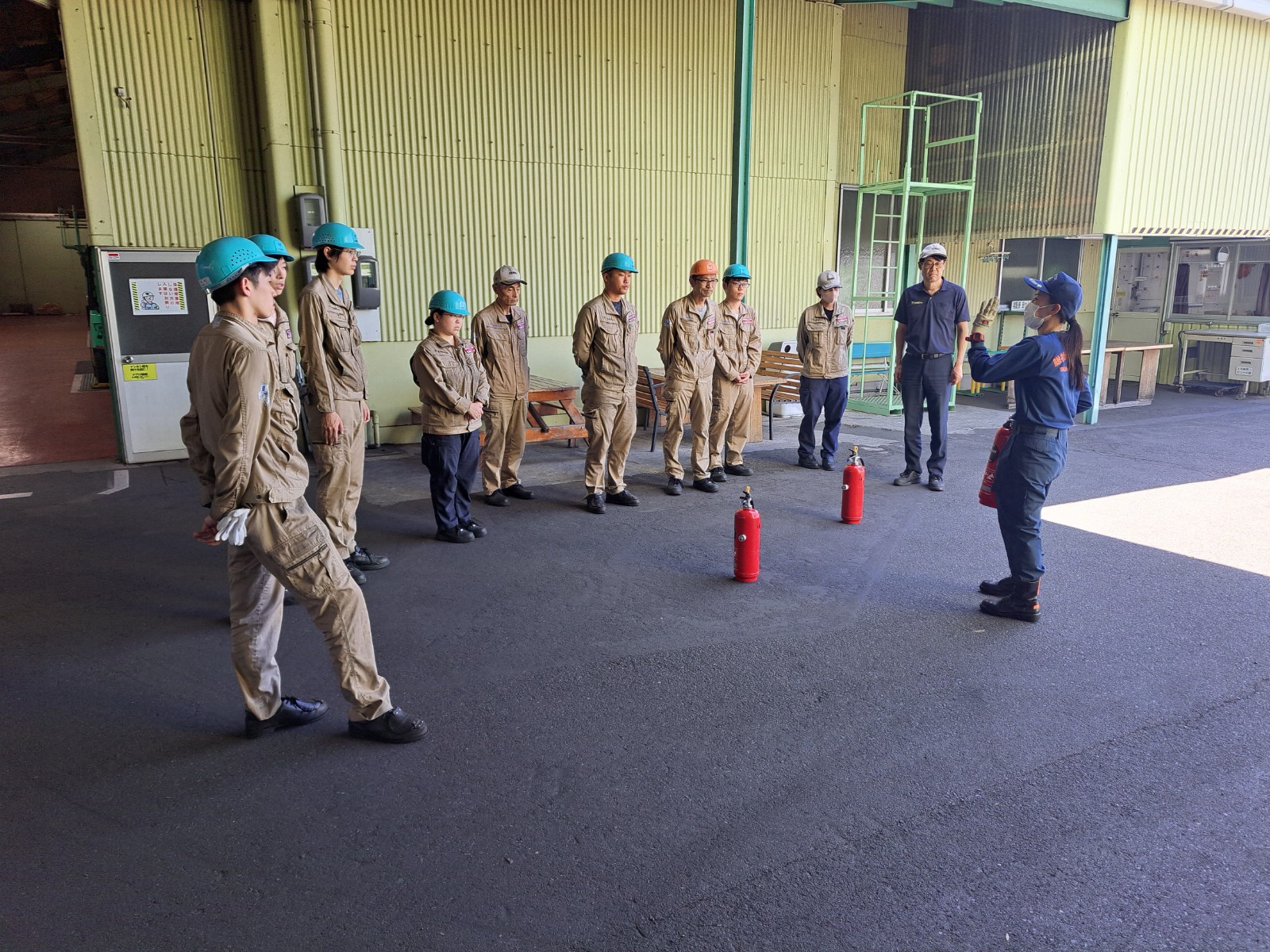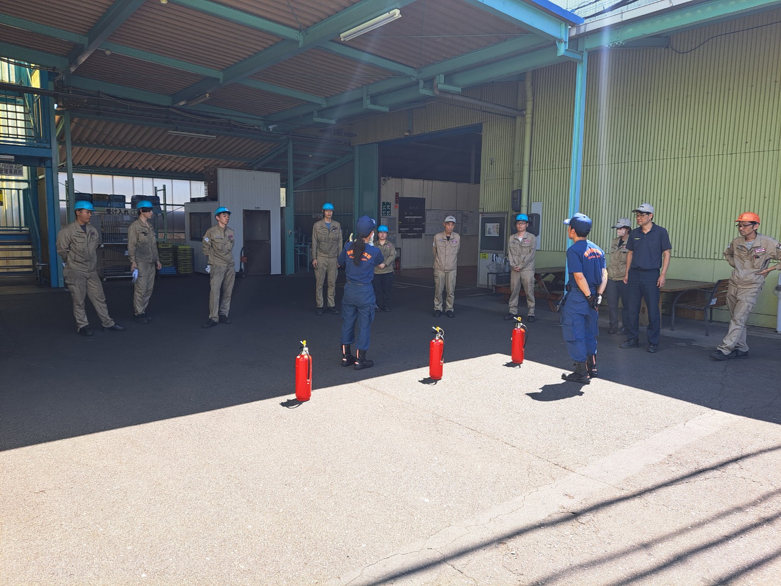 当社では毎年、総社市消防署の隊員の方々に来ていただき、防災講話、消火訓練、屋内消火栓の使用方法などについて、訓練を行なっていただいております。